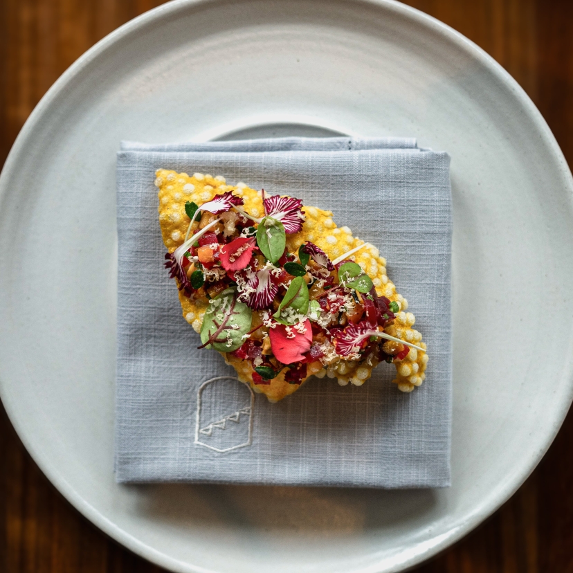 The journey begins with an irresistible amuse-bouche: Beet and Squash Tartare served on a tapioca crisp. The sweetness of the beetroot and squash meets the satisfying crunch of the tapioca, while a sprinkle of grated horseradish adds a zesty kick – the perfect way to awaken your taste buds for what’s to come.