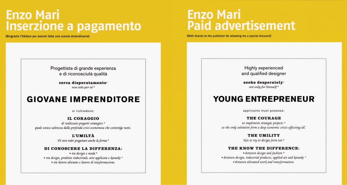 The large yellow poster at the entrance to giovane recreates an ad for “Giovane Imprenditor” (Young Entreprenuer) that created much industry buzz, published for a young entrepreneur with courage, humility and the ability to know the difference between the role of the designer and that of the entrepreneur. This self taught artist and industrial designer’s interest lies in the psychology of visual perception and exerts enormous influence within Italy.