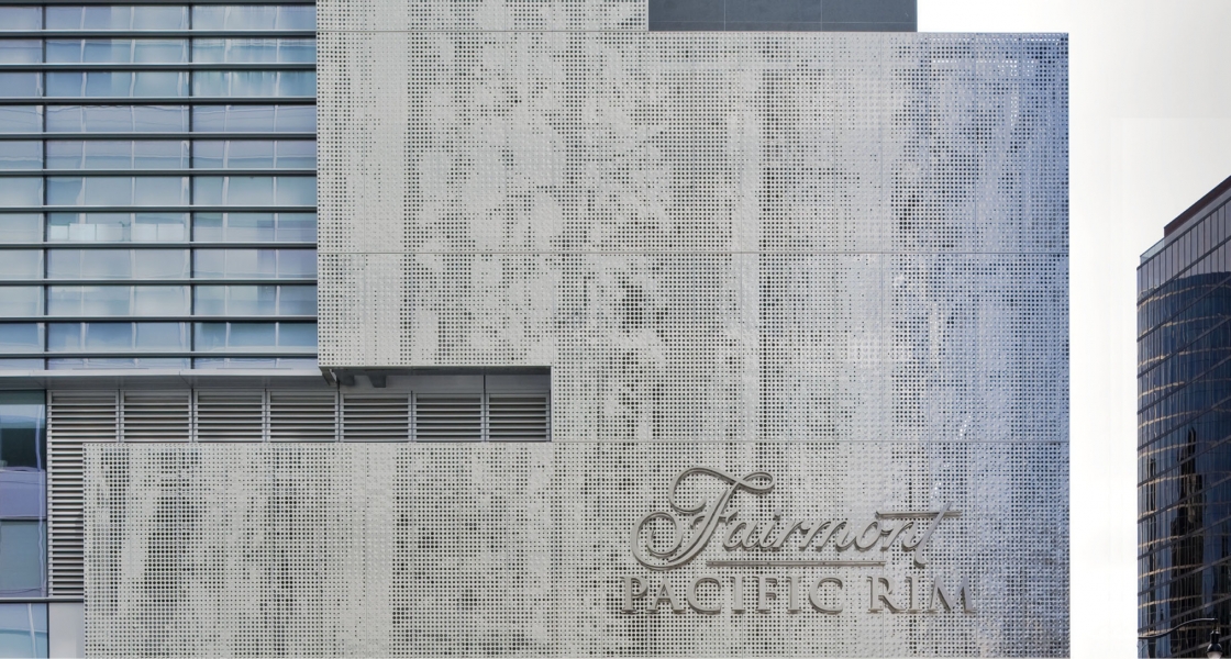 Designed by James KM Cheng, the Vancouver-based building architect, this screen uses a patented technology. Through thousands of texturally rich perforations, bumps and dimples on 9,500 square feet of stainless steel, an illusion of trees and light has been masterfully captured. It is best viewed from the south side of Cordova Street. A painting of Abstract Forest is anchored on the wall between the second and the third floor of the hotel’s interior.