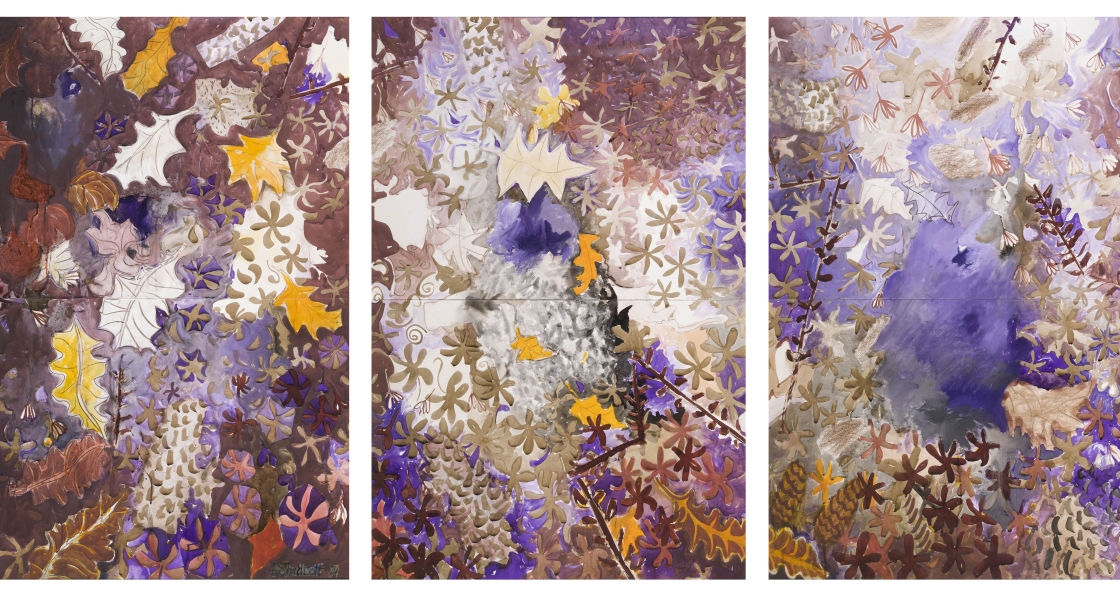 Shadbolt is known as one of Canada’s most innovative modernists, and he developed a unique visual language of abstract forms that were rooted in his observations of nature and the West Coast landscape where he lived and worked. The works on display in this exhibition showcase Shadbolt’s ongoing exploration of form through the natural world, using gesture, repetition, and experimentation. The centerpiece of the exhibition is a panoramic seven-panel work titled Morning Deck #2 (1980), which depicts the view from the artist’s home and studio on Hornby Island, British Columbia. This piece reflects the ambitious scale of Shadbolt’s iterative process, as adding multiple panels to a work allowed him to fully realize the potential of his subject matter.