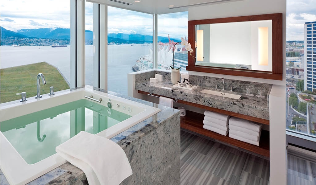 The planes skim along the surface of Coal Harbour before soaring to destinations deep in the mountains. You can take it all in from the comfort of your ofuro, a square, jetted Japanese-style tub, which the Fairmont Pacific Rim has positioned at floor-to-ceiling windows in rooms overlooking the harbor, the woods of Stanley Park, the Lions Gate Bridge, the snow-capped Coastal Mountains and beyond.”