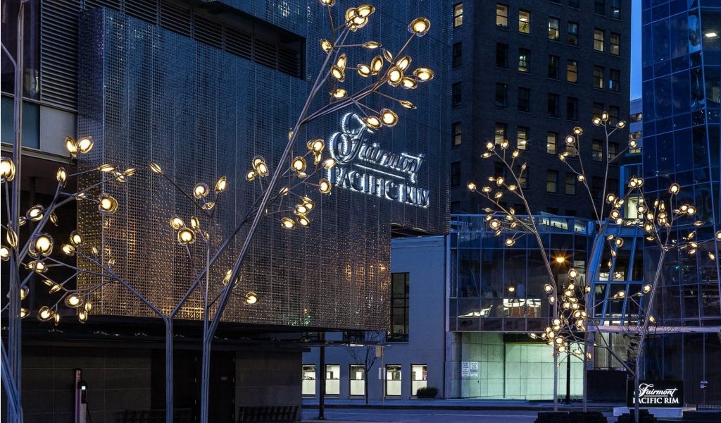Located in the middle of the driveway at Fairmont Pacific Rim and commissioned by Westbank, this outdoor art installation titled 16.480 by Omar Arbel is made up of glass tree-like minarets, emerging from constructed burnt wood planks and positioned to form a canopy of light. The piece was created by manipulating the seemingly simple process of pouring and layering hot glass and then illuminating with an internal LED lamp.